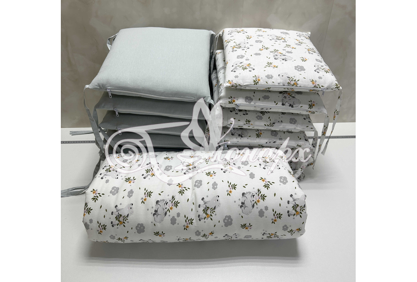Бортик составной: 12 подушек 31х34 см на замочках упакованы в сумку-переноску.