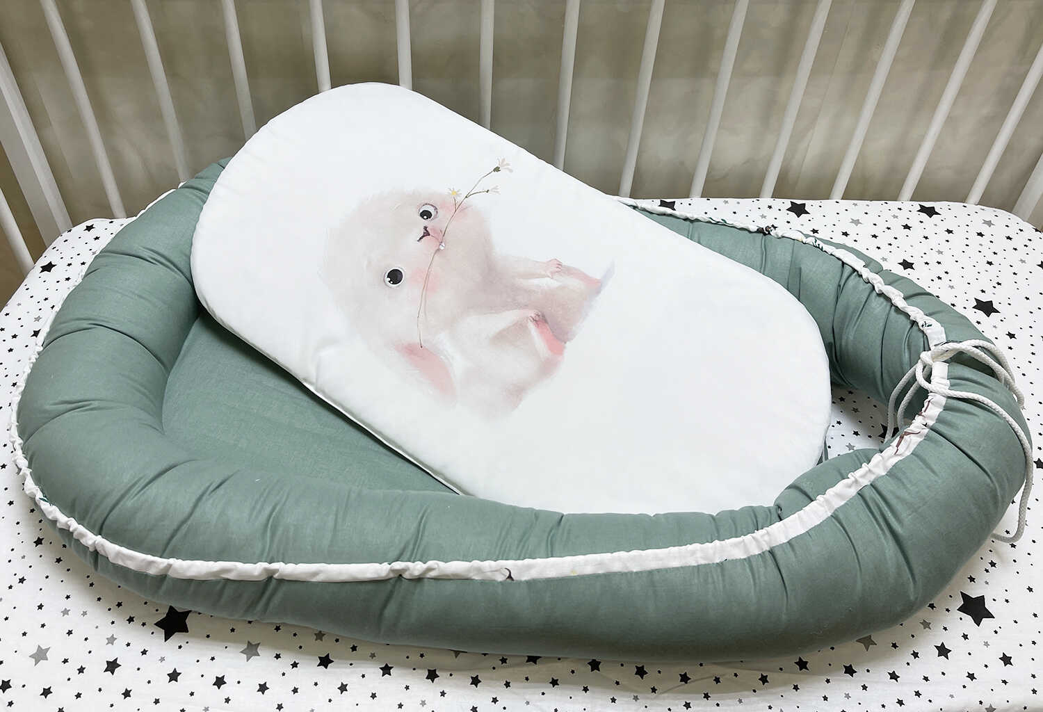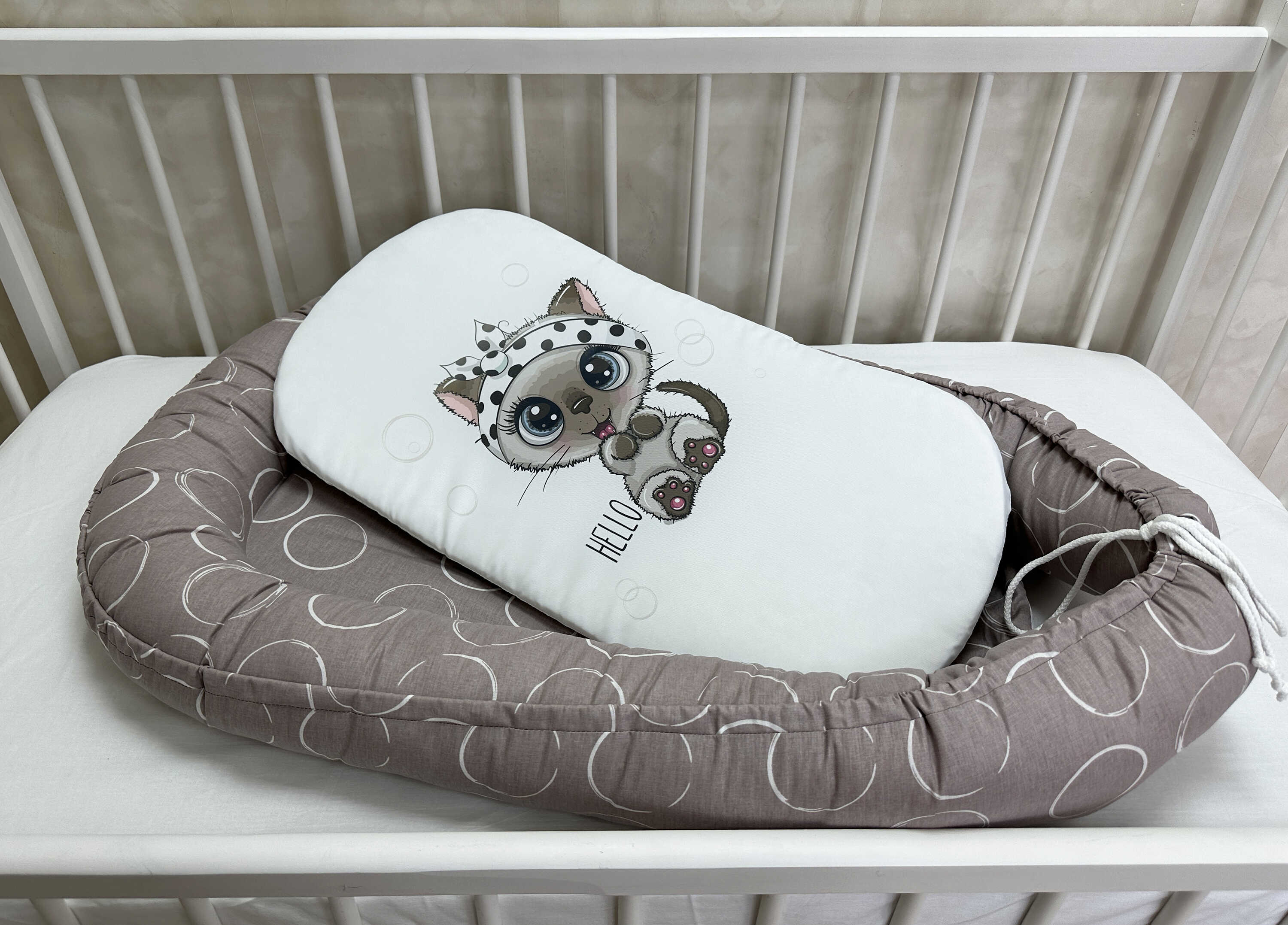 Ткань: хлопок 100%. Стандартная комплектация: кокон + матрасик с печатью (микрофибра). Наполн..