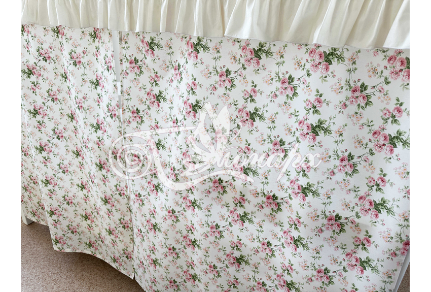 ширина - 137 см + 24 см на рюши (по 12 см на одну сторону). - Занавески с завязками (по 4 завязки на каждой занавеске) на переднюю сторону кроватки 2 шт.: